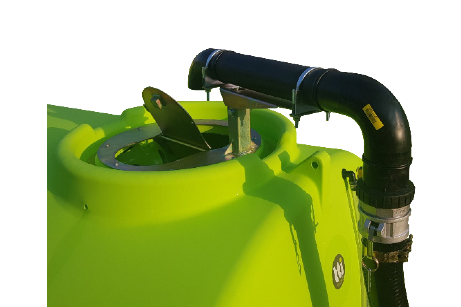 3″ Hydrant fill lid with Galvanised Funnel, fitted with 6″ air-gap and off-centre hinged latch, 3″ pipe running down to 1-way valve with male camlock