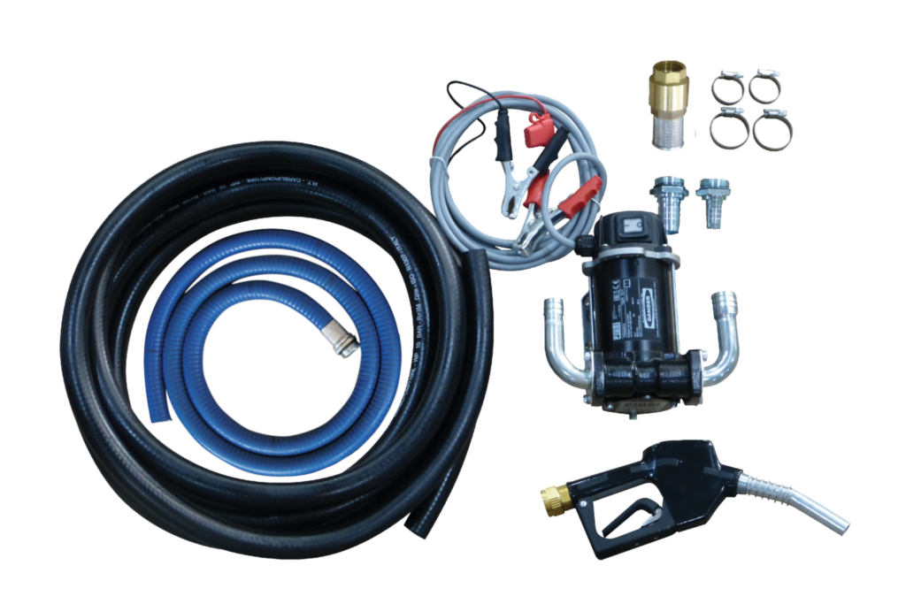 Puisi 50L/min 12 volt diesel transfer pump kit complete with auto shut-off nozzle & bracket, 6m of 20mm delivery hose, 2m of 25mm suction hose, 4m battery cables