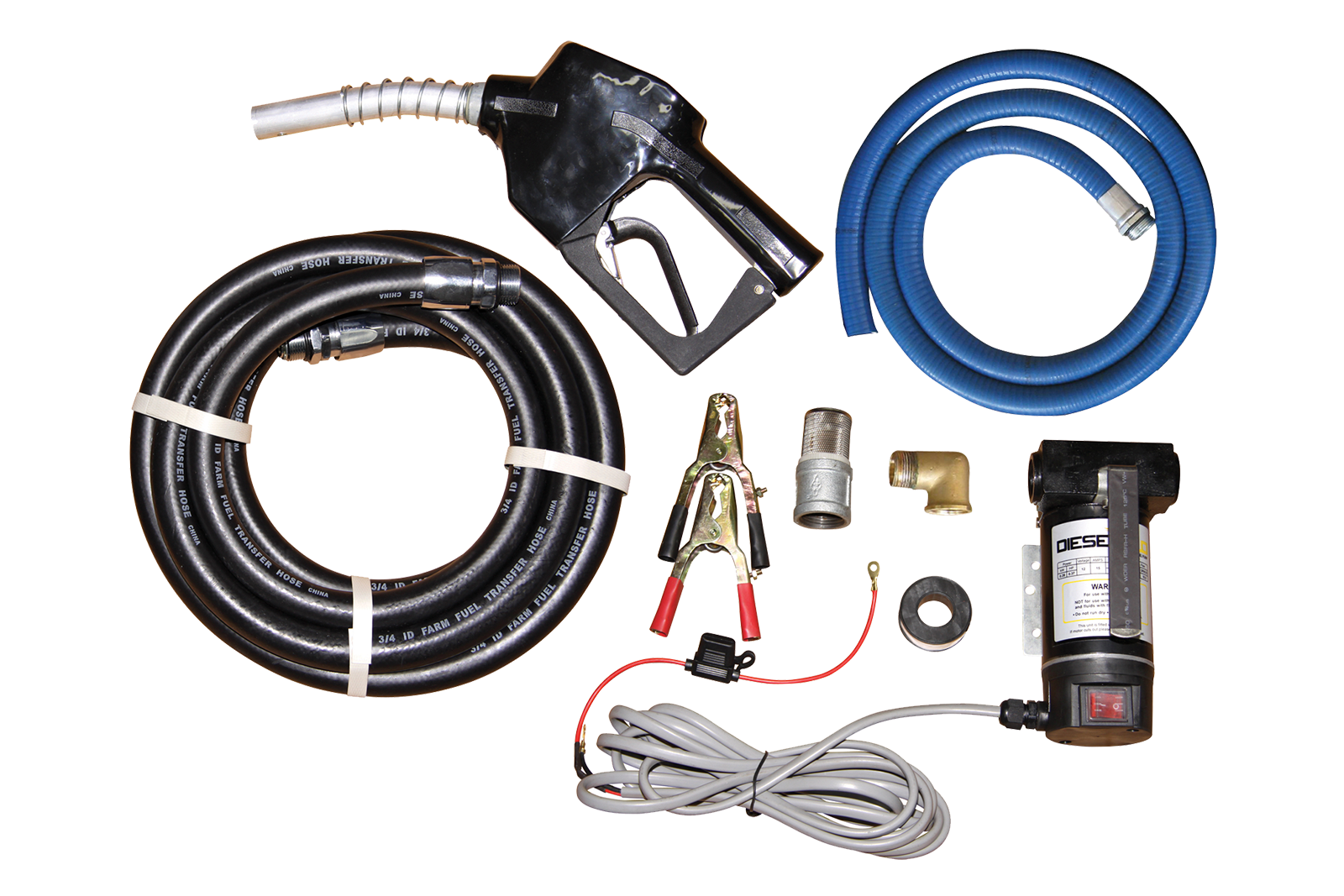 Transfer40 40 L/min 12 volt diesel transfer pump kit complete with auto shut-off nozzle, 4m of 20mm delivery hose, 2m of 25mm suction hose, 4m battery cables